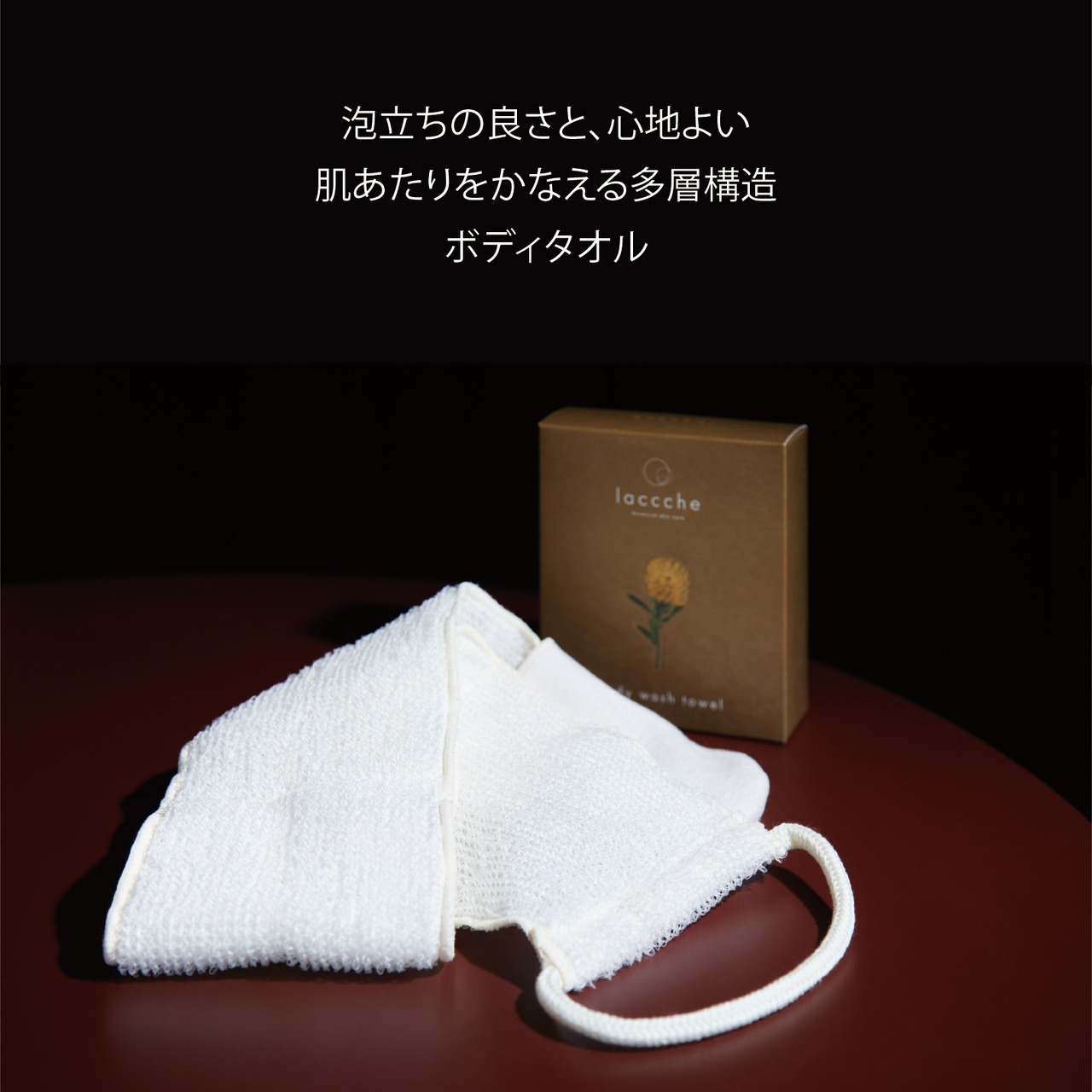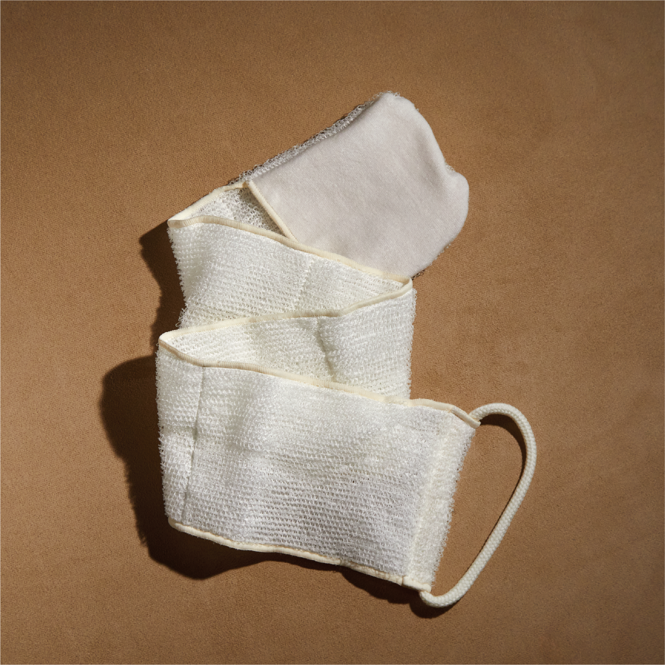 長いループパイルの生地を表面に使用することで肌あたりをやわらげ、やさしく洗浄します。