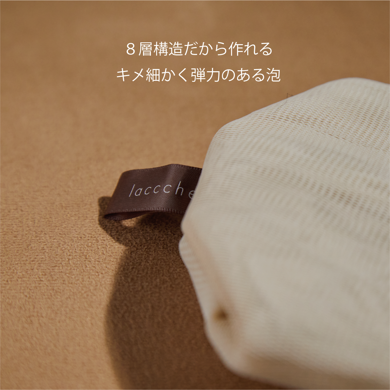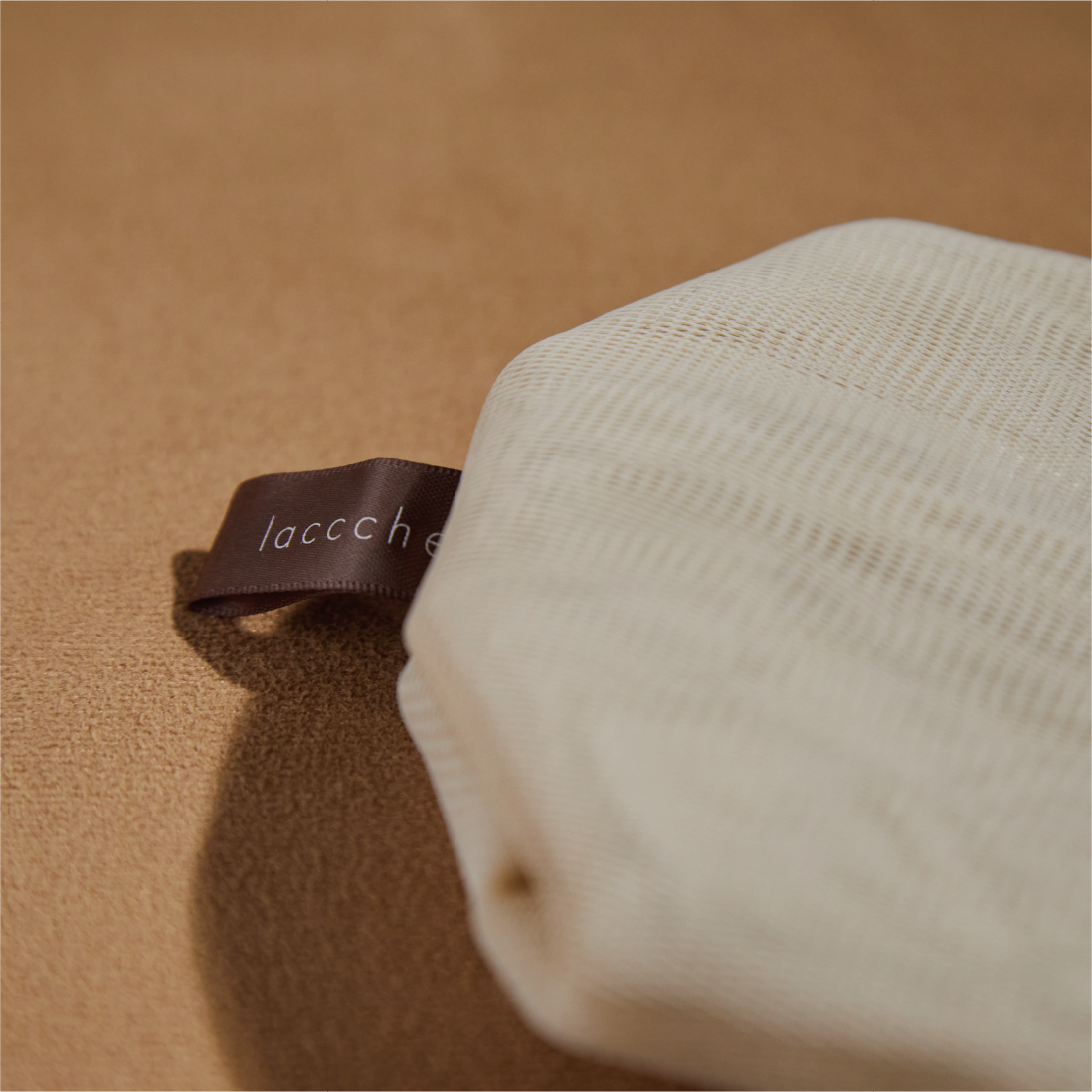 lacccheの泡立てネット:8層構造が空気と水分を効率的に取り込み、高密度で弾力のある泡を生み出します。この泡は洗顔時の摩擦を軽減し、肌への負担を軽減。